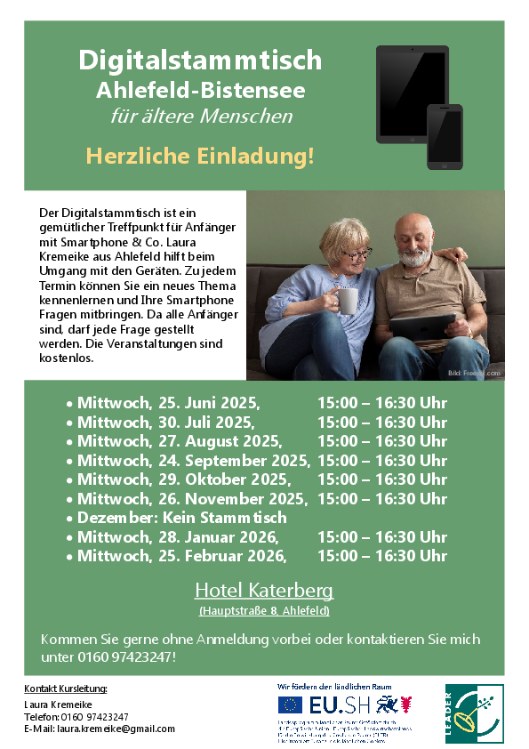 Die Digitalstammtische finden in verschiedenen Gemeinden statt und sind ein gemütlicher Treffpunkt für Anfänger mit Smartphone und Co. Digitalkümmerer und Digitalkümmerinnen helefen beim Umgang mit den Geräten. Alle sind herzlich eingeladen und es ist jederzeit möglich neu dazuzukommen!